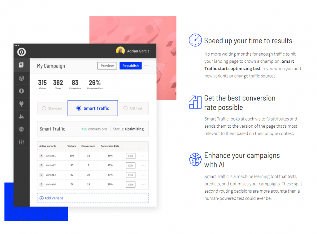 - A/B testing and Smart traffic are the tools used in this platform, enhancing the chances of profitable conversion rates.