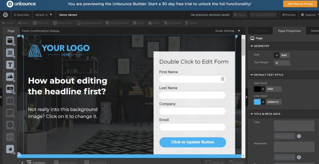 Step 3: Further, you will be directed to Unbounce Builder. Here, in this step, you can change or add enormous features like text, elements, background images, etc.