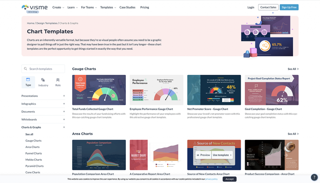 Charts are an excellent way to display data visually and engage viewers, and Visme offers a wide selection of pre-existing chart templates. Whether you need to create a pie chart, line graph, or bar chart, Visme offers many choices.