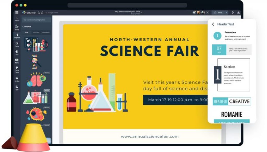 In short, due to its user-friendly project editor, vast asset libraries, and customizability, Visme is a fantastic choice for anyone who wants to create beautiful designs without going through the grind of learning complicated software.