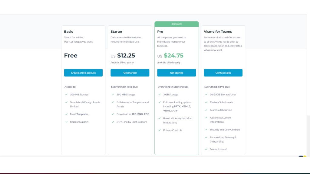Visme is slightly more expensive than some competitors, but it still provides a variety of features and plans to choose from. Visme may be worth the investment if you’re looking for a tool with advanced features like brand kits and team collaboration.