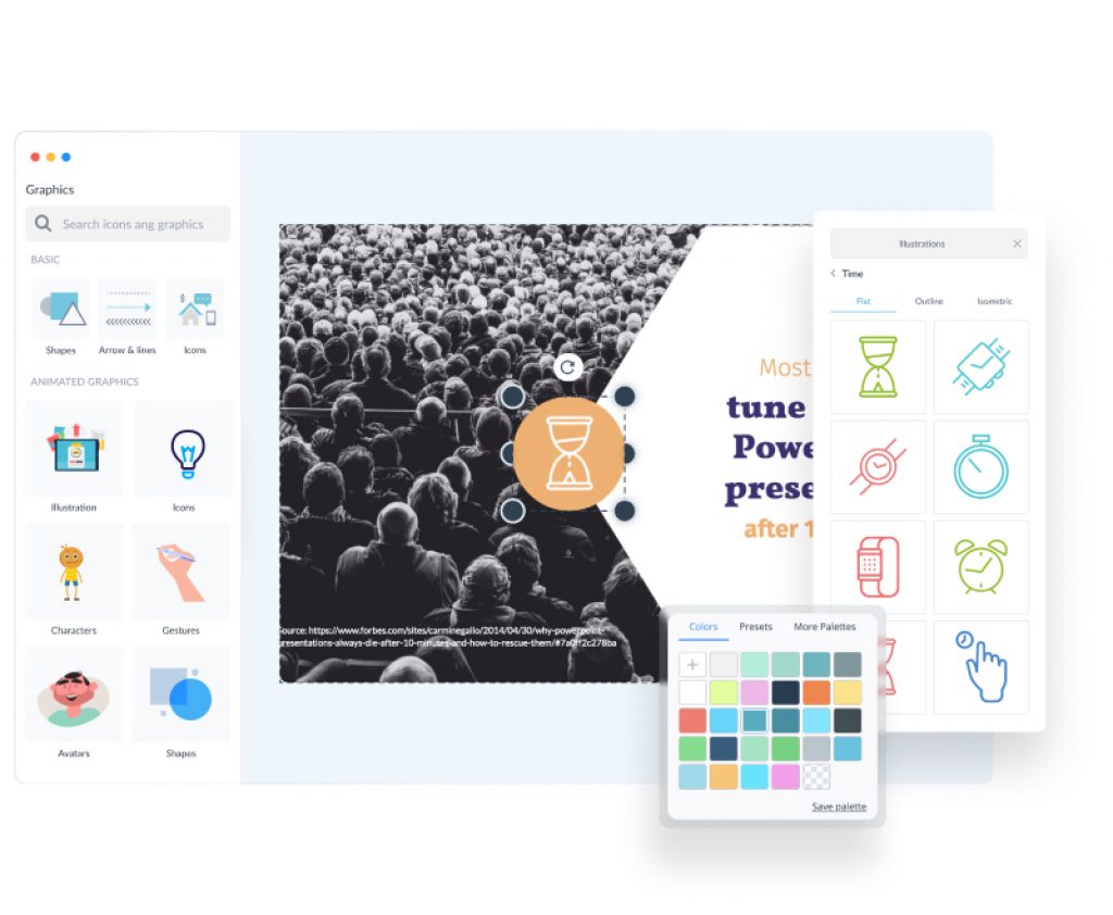 - It provides a large selection of vector icons and graphics from which users can choose, with the option to customize their colors as needed.