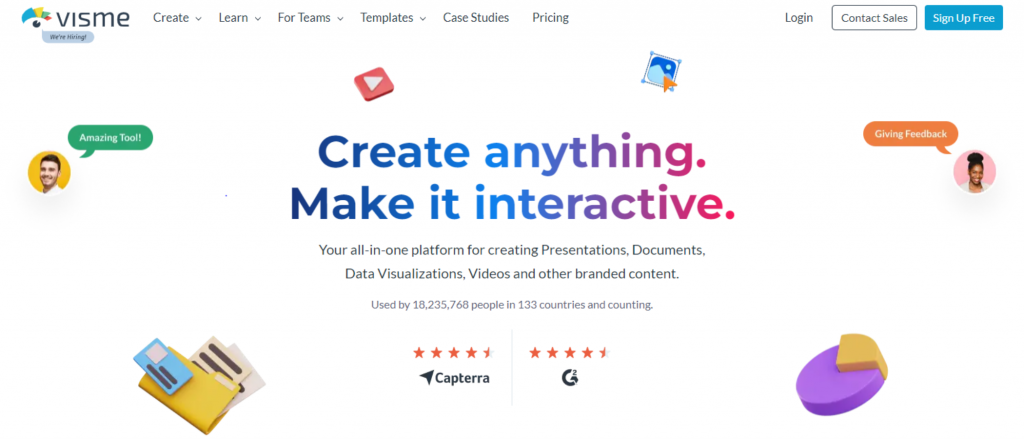 Visme is a comprehensive visual content creation and collaboration online design platform that allows users to create engaging presentations, social media infographics, mockups, reports, graphics, and other types of design.