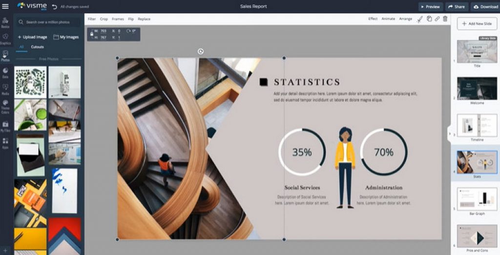 - Users can easily create visually stunning images without installing any software, thanks to Visme’s robust and user-friendly photo editor.