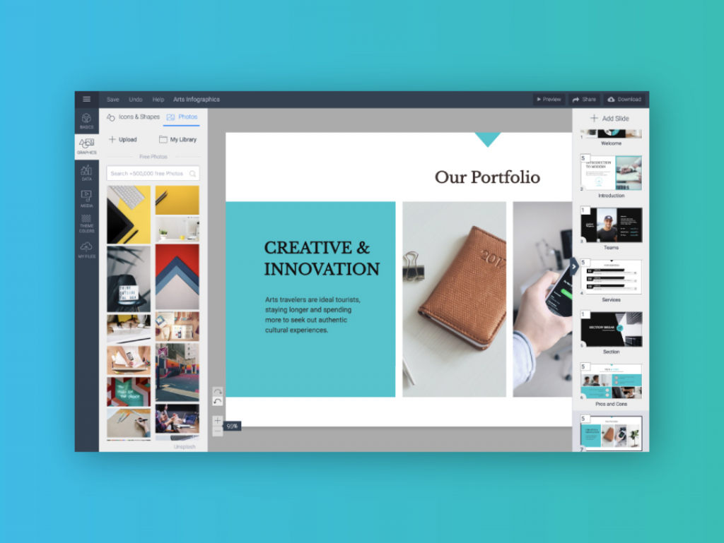 Ans: It features a variety of tools and editable templates for designing custom graphics, themes, presentations, and infographics. Some of its features include drag-and-drop design tools, customizable templates, data visualization tools, multimedia integrations, and collaboration capabilities, which make it an ideal go-to tool.