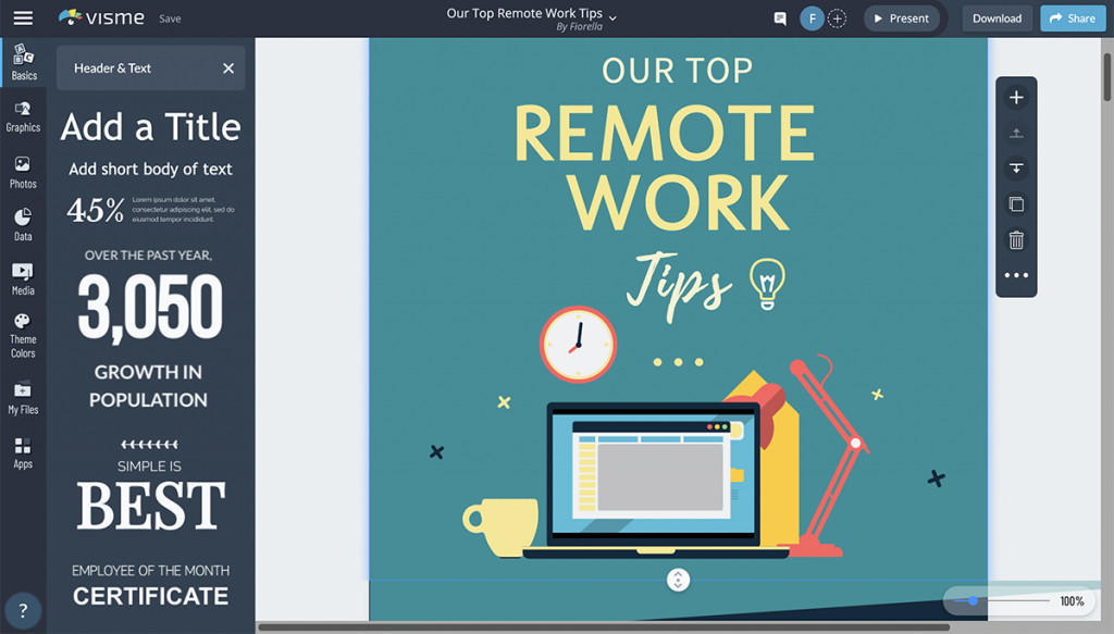 When you’re ready to share your design, Visme provides numerous options. You can save your design as a PNG, PDF, or HTML file, or share it on social media. Visme can also be used to present your design directly, making it an excellent tool for remote meetings and presentations.